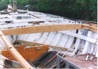 De meget optimistiske forestillinger gik på, at vi kunne nøjes med at skifte de finerplader (6 mm østenfiner), som var lagt ovenpå dæksbrædderne, og ja så måske et par brædder og hvis det gik helt galt en enkelt eller to dæksbjælke. - Vi skulle hurtigt blive klogere.