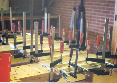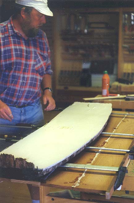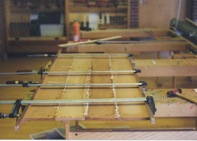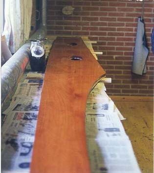Vi besluttede os for at lave en sandwich-konstruktion, hvor vi limede mahognien op på noget meget dyrt og dejligt finer, støbefiner hedder det i folkemunde. På den måde håbede vi på at kunne undgå de revner, som er begyndelsen til alt træs undergang.