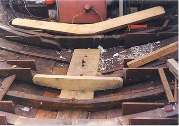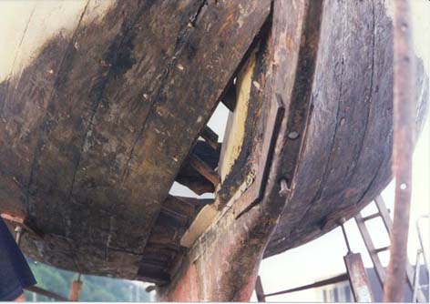 Det var imidlertid ikke kun overbygningen, der var problematisk. Mågen var oprindeligt bygget med sænkekøl, og da den fik sin betonkøl, blev hullet efter sænkesværdet spunset ud. Man valgte at fastholde spunsen med kraftige jernsøm (jernsøm er måske noget af et mest overvurderede til skibsbygning). Nu var sømmene væk, og i deres sted var der store rådne områder i køltræet. Samtidig fandt vi ud af at bjørnen, det stykke træ der samler køl og forstavn, var ødelagt. Ikke rådnet væk, men delamineret. Det var en ny oplevelse for os, at egetræ kan delaminere, men man kunne pille det fra hinanden i lange flager.